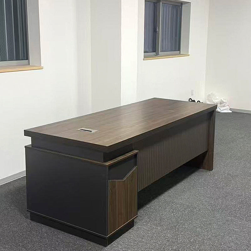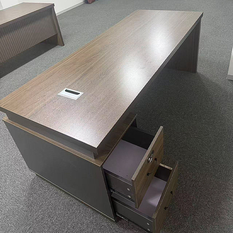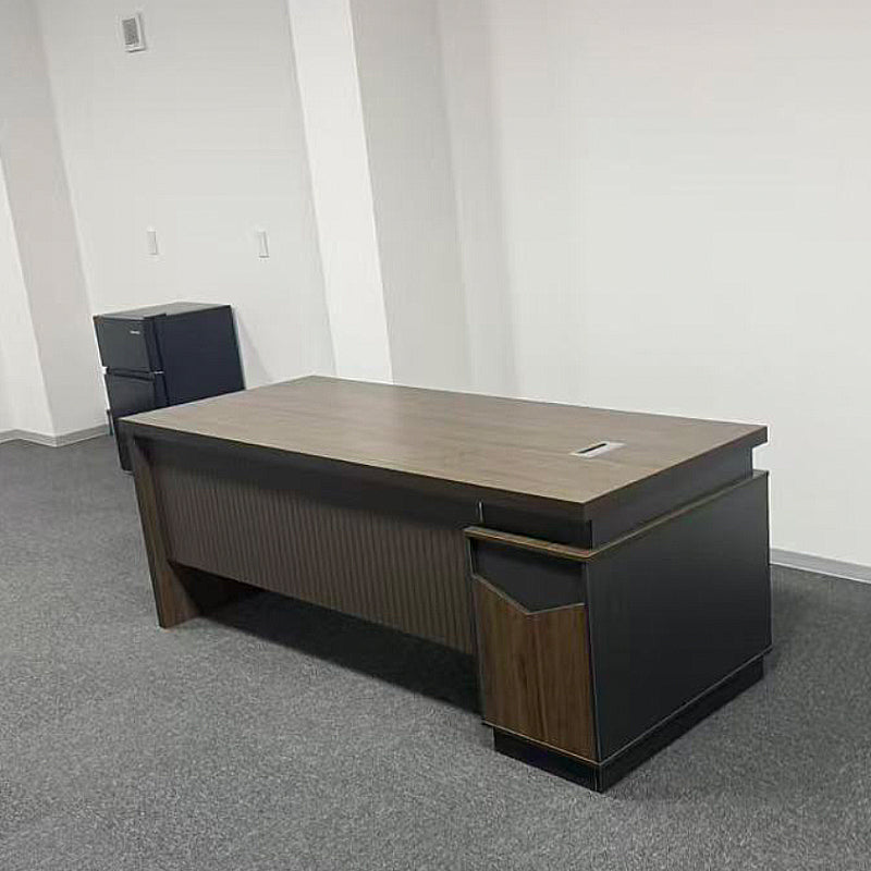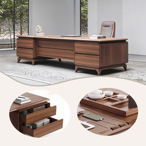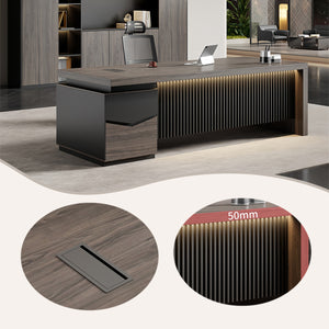 シンプルながら洗練されたデザインのエグゼクティブデスクです。広々とした天板と高級感のある木目調仕上げで、オフィスや在宅ワークに最適です。耐久性に優れた素材を採用し、配線用の付きでデスク周りもすっきり。別売のサイドキャビネットは分割式で、必要に応じて自由に配置可能。